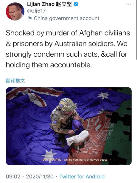 在赵立坚推特发出2小时后,澳大利亚总理莫里森澳大利亚要求中国正式道歉,理由是中国发布和伪造一名澳大利亚士兵割喉儿童的宣传图。莫里森竟称,“中国政府应当感到十分羞愧,这种行为使他们的国际形象受损。”