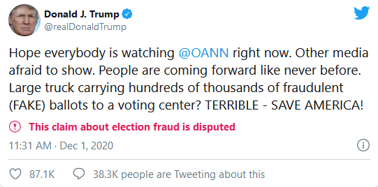 在美联社发表这篇文章后不久,特朗普再次在推特上发表了关于选举舞弊的声明。