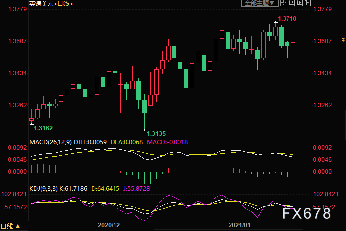 欧洲时段,英镑兑美元走高,现报1.3617,涨幅0.22%,鉴于在疫苗接种方面英国领先,而欧洲其他国家则相对缓慢才开始,分析师看多英镑。丹麦丹斯克银行资深分析师Mikael Milhj说,“我们继续认为今年英镑更可能走强,因为英国疫苗接种比欧盟快得多。” 今日稍晚,英国央行首席经济学家霍尔丹(Andy Haldane)将发表讲话。ING策略师在给客户的报告中说,“英国央行首席经济学家霍尔丹今天的演讲不太可能对英镑有太大影响,因为在央行总裁贝利上周发表评论后,市场已做出调整降低了负利率的可能性。”英镑兑美元短线支撑位下看至30日均线切入位1.3507,如果进一步失守1.35心理关口,则短线进一步下行空间将打开。在小时图表上技术指标获得负面动能进一步加强了看跌前景。但日线图上的震荡指标尚未证实看跌倾向,因此要留意近期震荡区间上方1.37、下方1.35这两个水位,想哪一方突破,则后续走向将会变得明显。