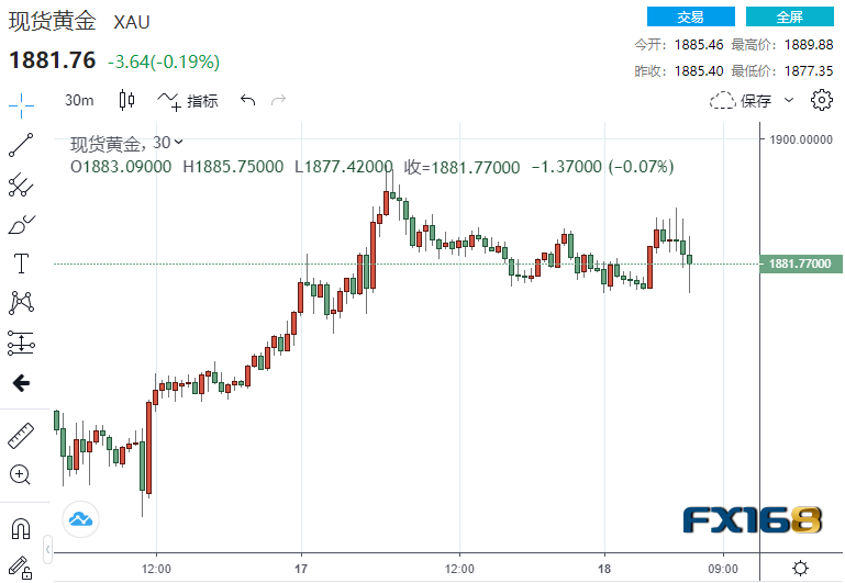 美市盘中,现货黄金自高位下跌逾10美元至1880美元/盎司关口下方,现小幅回升至1880美元/盎司关口上方交投。