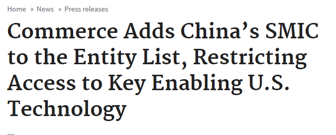 当地时间12月18日,美国商务部在官网宣布将中国的中芯国际列入实体名单,限制了对美国关键技术的获取。