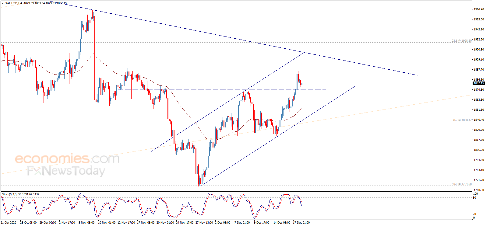 从4小时图来看,EMA 50指标继续支持金价延续看涨走势。需要指出的是,一旦金价跌破1875.00美元/盎司,这将令金价承压并测试1843.00美元/盎司,然后重新尝试反弹。