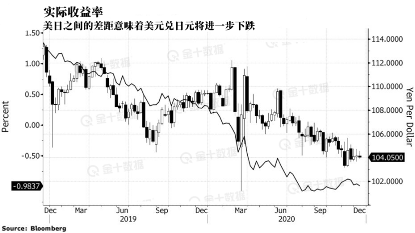 再来看收益率,尽管通胀预期已经攀升,但美国10年期国债收益率仍低于1%。另外,美联储相对于日本央行实行更宽松的货币政策也令美元承压,这意味着美国实际收益率可能在已经处于负值的基础上继续下跌,比日本的实际收益率更低。在经历了量化宽松、负利率和收益率曲线控制之后,日本央行的弹药似乎已经用尽。