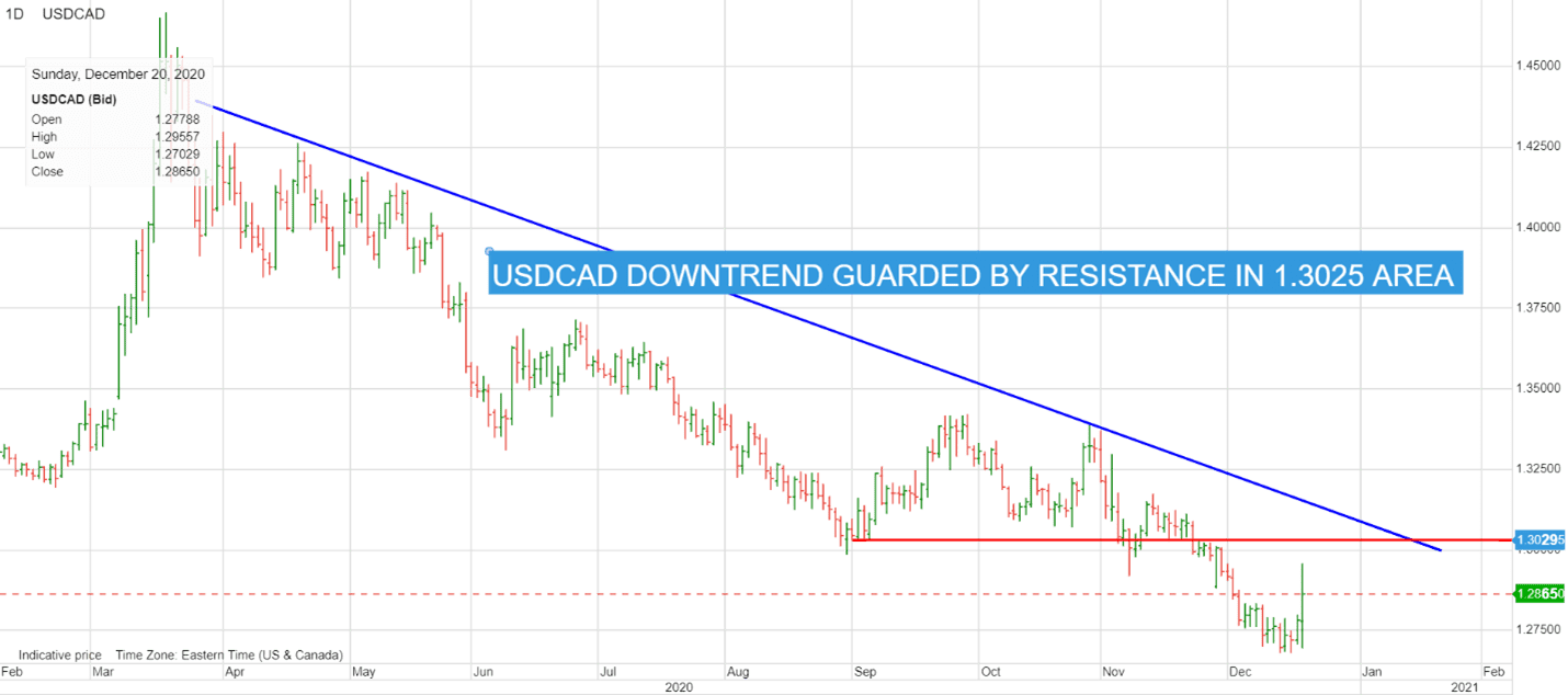 美元/加元:跟随澳元/美元和纽元/美元的自由下跌一路飙升。美元/加元上涨至1.2956,这是12月3日所见的水平。原油价格的大幅下跌进一步推动了美元/加元的上涨。WTI原油价格从上周五49.08美元/桶的收盘价跌至46.11美元/桶。加拿大大部分地区出台更多限制冠状病毒措施的消息,可能也刺激了美元/加元的需求。美元/加元的技术面在1.3150下方看跌,该水平受到阻力位1.3025的保护。