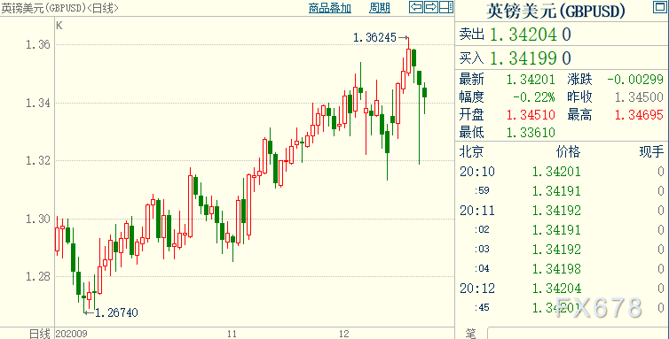 由于担心新发现的变异新冠毒株具有高传染性,全球多个国家及地区(主要集中在欧洲)周一纷纷对英国关闭边境。周一盘中,英镑重挫逾2%至12月11日以来低位1.3189。