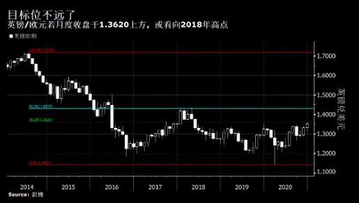 英镑兑美元已试探2014-2020年跌势的38.2%斐波那契回撤位1.3620。若收盘突破这个水平,将试探在2018年1月的1.4345和4月的1.4377这两大关键高位附近的强烈阻力位。