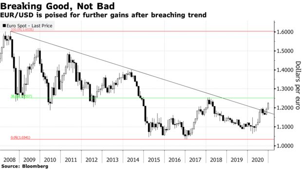 彭博美元指数目前已经跌破了多年来的上升趋势线和一道受到密切关注的斐波那契水平。接下来,美元自2011年以来波峰至低点间的50%斐波那契回撤位将再度受到考验。该回撤位曾在2018年美元大跌之时对其形成支撑。