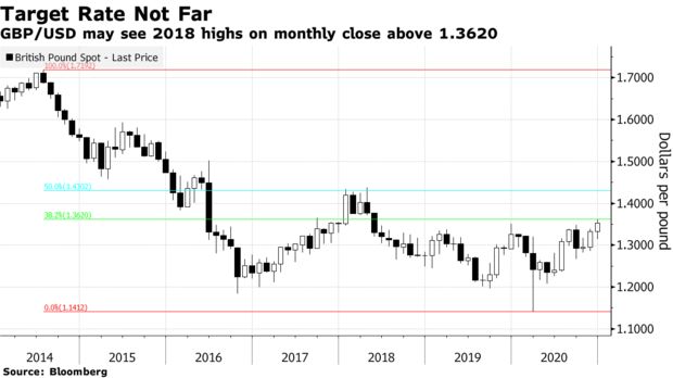 英镑兑美元本周稍早已经测试了1.3620,这是2014-2020年跌势的38.2%斐波纳契回撤位。如果收在这一水平之上,进一步的压力位考验将位于2018年的两个关键峰值区域——当年1月高位1.4345和4月高位1.4377。