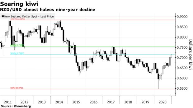 纽元兑美元已经升穿了0.7156,这是2011-2020年高低点之间的50%斐波纳契回撤位。在此区域出现的回调幅度暂时仍不大。若月线收盘位高于此水平,纽元兑美元将进一步看向2017年7月的高位0.7558,该水平接近其61.8%斐波那契回撤位0.7555。