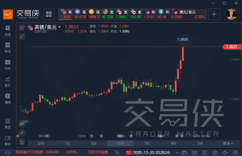 周三晚间,欧盟消息人士表示,欧盟成员国已经开始准备1月1日开始的新英国贸易协议的临时申请程序。欧盟委员会告知欧盟成员国,如果今天达成协议,将于周四上午举行会议。随后英国太阳报报道,脱欧协议近在咫尺,英镑兑美元站上1.35,日内涨1.11%。