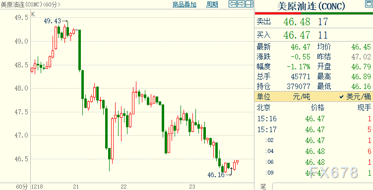 北京时间15:16,NYMEX原油期货下跌1.19%至46.47美元/桶;ICE布伦特原油期货下跌1.16%至49.58美元/桶。