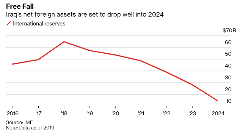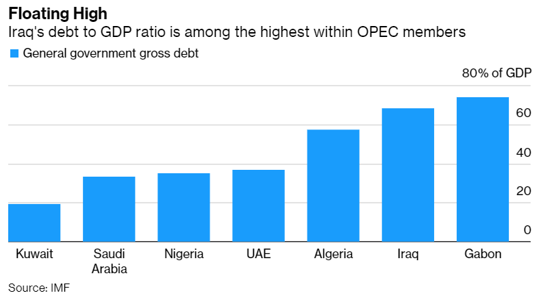 IMF预测,到2024年,伊拉克的外汇储备将继续大幅下降。它的债务与GDP之比是欧佩克中最高的。
