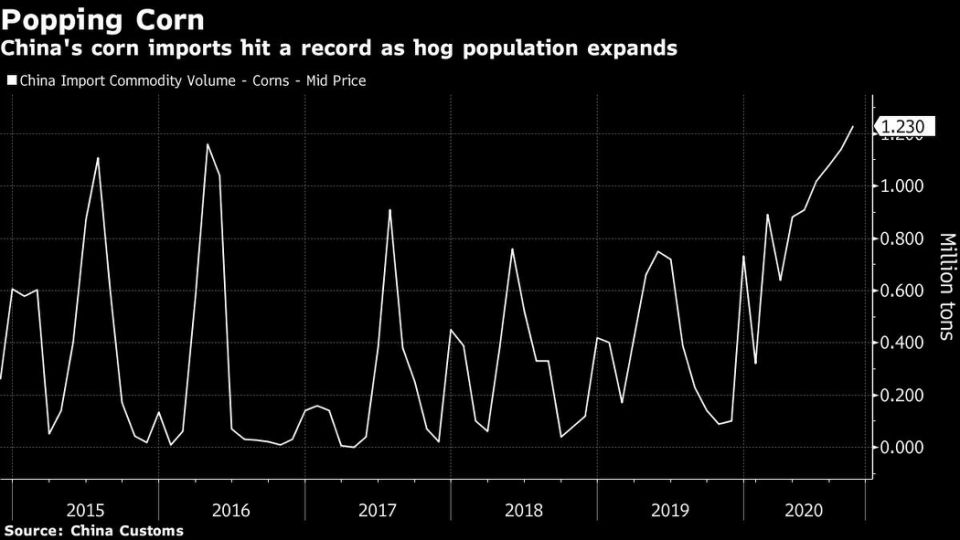 中国11月玉米进口量创历史新高,为迈向自1988年来最长涨势的全球玉米价格带来另一波乐观情绪。根据周四的海关数据,中国上个月购买的玉米同比增加12倍。今年1-11月,玉米进口量成长一倍以上,达到900万吨,进一步超过了其对世界贸易组织承诺的720万吨。芝加哥期货交易所3月份交割的玉米期货连续第10天上涨,这是自1988年以来最长的涨势。玉米价格一度上涨0.4%至每蒲式耳4.49美元。
