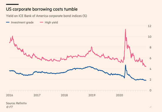 在美联储救市并创造托底预期后,美国企业债收益率已降至多年低点,催生出2020年创纪录的2.5万亿美元发行量。借款狂潮将更高评级的投资级公司的杠杆率(衡量债务与盈利的比率)推至历史最高水平。与此同时,企业偿债能力有所下降,所谓的僵尸企业的数量——其支付的利息已连续3年高于利润——接近历史高点。