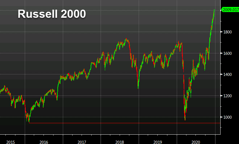 罗素2000指数周三收涨0.87%,报2007.10点创史高,盘中一度刷新纪录高点2011.84点。有华尔街人士调侃称;“在升破2000点后,罗素2000指数这回终于名副其实了”。事实上,小盘股的领衔上涨,已成为了近期美股一道亮丽的风景线。在今年3月最初受到疫情冲击时,罗素2000指数曾一度较1月高点暴跌42%至966点的低位,但现如今,指数已较低点翻番!