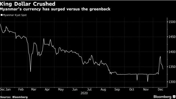 作为全球储备货币,美元表现不光落后于其他G10货币,其跌幅在处于全球金融边缘的一些发展程度较低的市场,显得更为明显。缅元兑美元今年的涨幅便高达11%,在亚币中表现最好。缅元汇率的升值,反应了许多新兴市场的现状:居家令不仅削减了非必需支出,进口也随之暴跌。直到疫情爆发前,Zaw Moe Ko对缅甸商业中心仰光的老板以美元支付给他工资,还感到挺高兴,但他现在恨不得马上脱手。