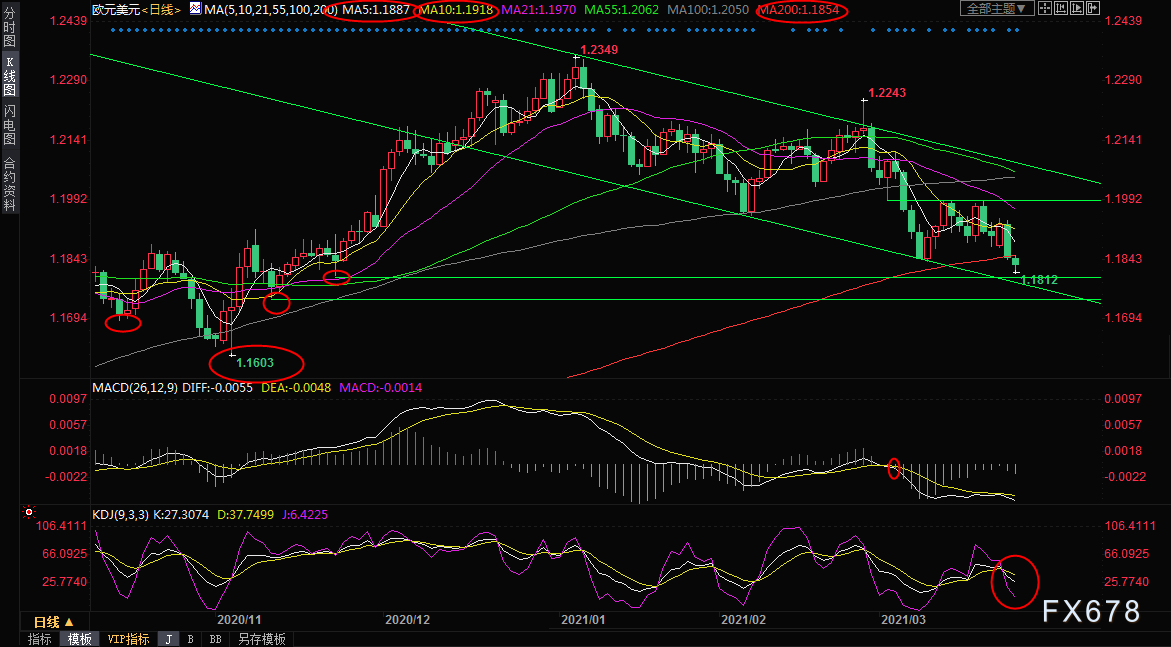 周四(3月24日)亚欧时段,欧元兑美元延续跌势,最低触及1.1812,为四个月新低,目前交投于1.1832附近,从技术面来看,汇价已经失守200日均线,看空信号有所增加,后市面临进一步下跌风险。