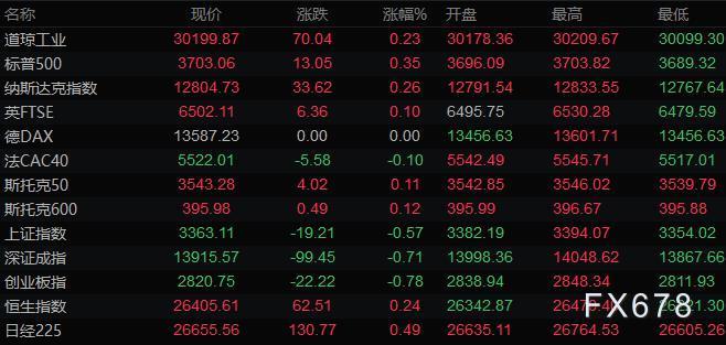 美股三大指数全部收涨,标普500指数收盘上涨13.05点,涨幅0.35%,报3703.06点;纳斯达克指数收盘上涨33.62点,跌幅0.26%,报12804.73点;道琼斯指数收盘上涨70.04点,涨幅0.23%,报30199.87点。