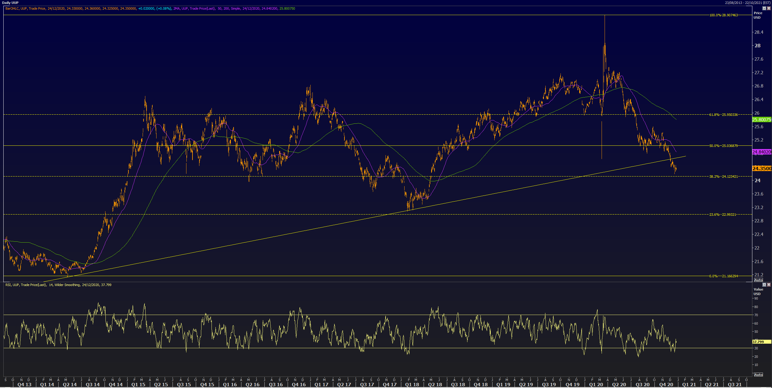 UUP在12月中旬触及24.2美元的低点,这是该指数在21.2 - 28.9美元区间的38.2%斐波那契回撤位。移动平均线等指标仍然发出强烈的看跌信号,但分析师认为现在是UUP逆转的好时机,第一目标位为25美元(50%斐波拉契回撤位),而且应在24美元的心理支撑价位下设置止损点。
