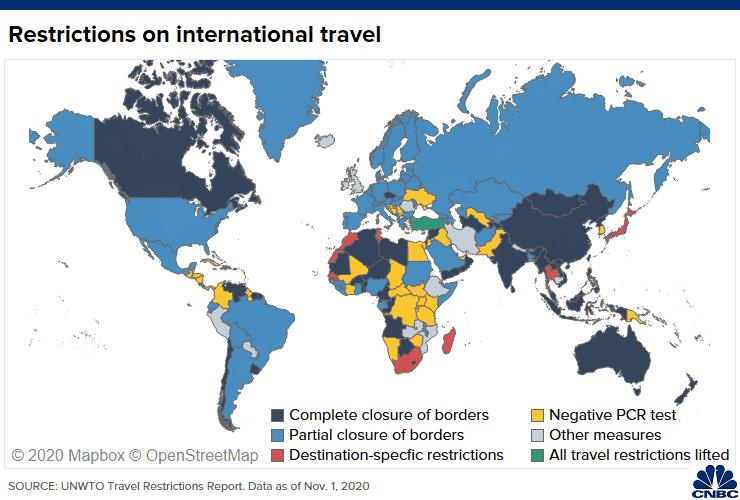 世界各地的封锁的一个主要特点是完全或部分关闭边境,这导致很多国际旅行暂停。
