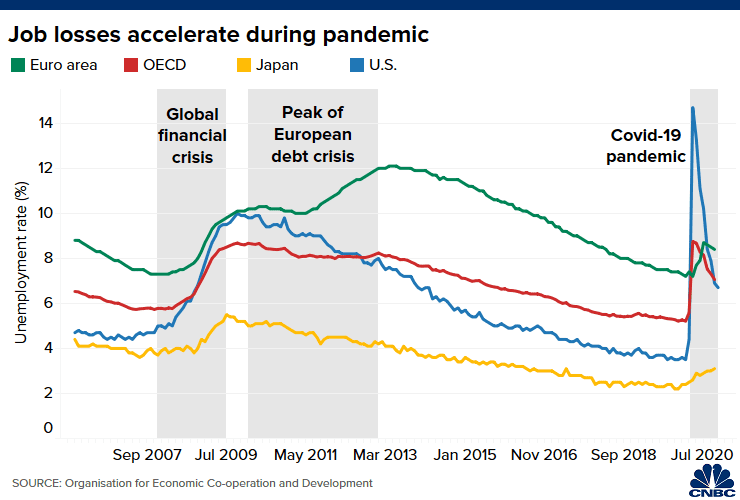 大流行引起的经济衰退的主要后果是全球失业人数大幅增加。经合组织表示,在某些国家,疫情对劳动力市场的早期影响“比2008年全球金融危机头几个月所观察到的影响大十倍。”
