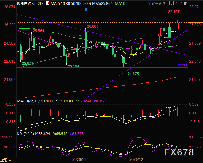 日线级别:KDJ金叉,MACD金叉,整体震荡上行,银价目前站稳5日均线。下方初步支撑在26关口,进一步支撑在10日均线25.48,上方初步压力在27关口,进一步压力在21日高点27.4。