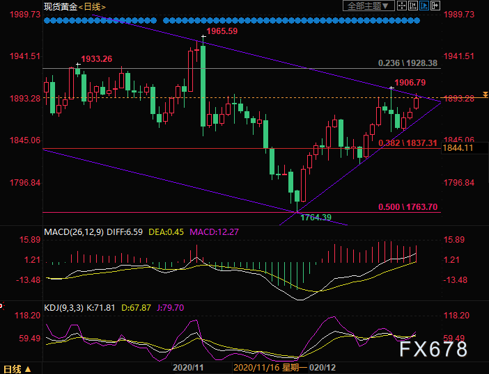 日线级别:KDJ金叉,MACD金叉,整体震荡偏上行,短线有望进一步上涨,不过上方面临1900-1910区间的强阻力,12月21日金价曾一度短暂突破1900,后被证明是假突破,投资者需警惕假突破行情。上方初步压力在布林带上轨压力1907附近,进一步压力在23.6%斐波水平1928,下方支撑在1875,进一步支撑在1850。若金价跌破上行趋势线,短期加大看跌风险。突破上方阻力区间则有望进一步直接挑战2000大关。