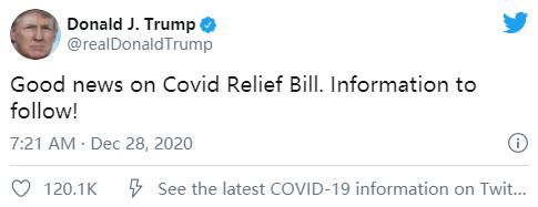 在日内稍早,特朗普的一条推文就曾让人们重燃了希望。特朗普在推特上表示,疫情纾困法案方面有好消息,将有更多信息跟进。