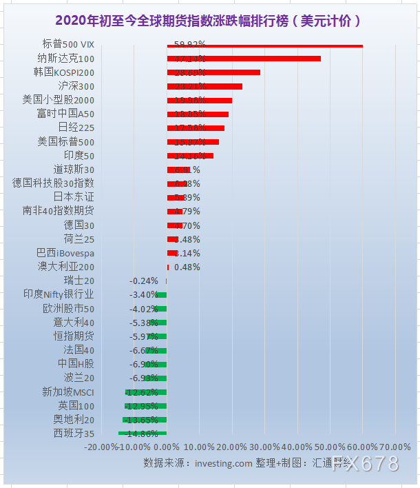 下图为2020年主要全球股指期货涨跌排行一览(数据截止2020年12月29日):