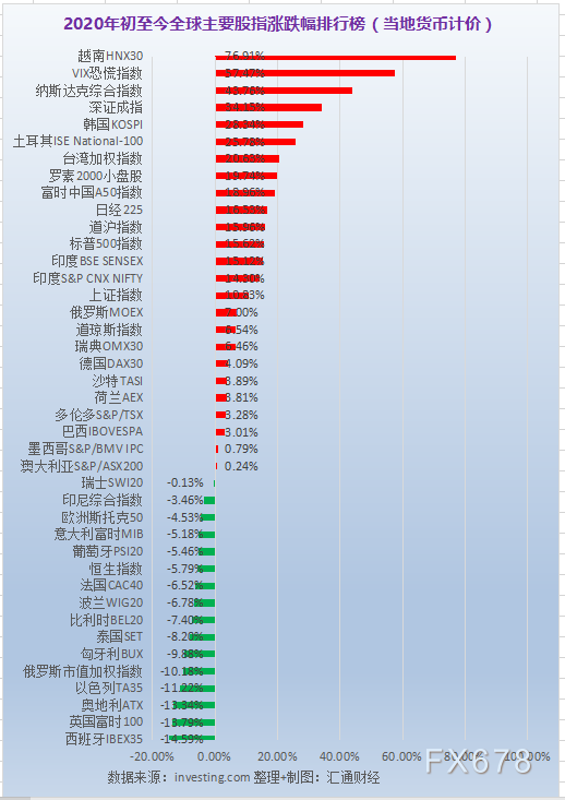 下图为2020年全球股市涨跌排行一览(数据截止2020年12月29日):