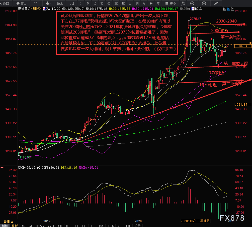 【黄金】 从周线级别看,行情在2075.47遇阻后走出一波大幅下跌,下方在1770附近获得支撑进行大区间整理,在很长时间内可以关注2000附近的压力位,2021年将会延续很久的整理,2021年有望测试2030附近,但是再次测试2075的位置是很难了,因为此位置有可能成为1-3年的高点,后面有效跌破1770附近的话有望继续走势,下方的重点关注1670附近的支撑位,此位置做多也是有一波大利润,跟上节奏,利润不会少的。(仅供参考)