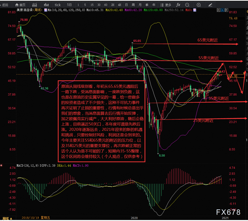 【原油】 从周线级别看,曾在2020年初从65.65美元遇阻后一路下跌,受消息面影响,一度跌到负数,这也是在原油历史上实属罕见的一幕,给一些做多的投资造成了不少损失,这种不可抗力事件再次证明了止损的重要性,行情有时候总是出乎我们的想象,当消息面散去后行情开始反弹,加之欧佩实行减产,大大利好原油,随后原油企稳后上涨,目前逼近50美元关口,本年度可谓是先跌后涨。2020年逐渐远去,2021年盈利的新的机遇和挑战,只要控制好风险,利润还是会到来的。2021年主要关注55和65美元附近的压力位,以及35美元和25美元附近的重要支撑位,再次跌破正数的话个人认为是不可能的了,短期内35-55美元之间整理,预计这个区间将会维持较久,技术面上看MACD指标仍在0轴之上金叉上行,就算到了50美元附近就会有一个大幅回调。(个人观点,仅供参考)