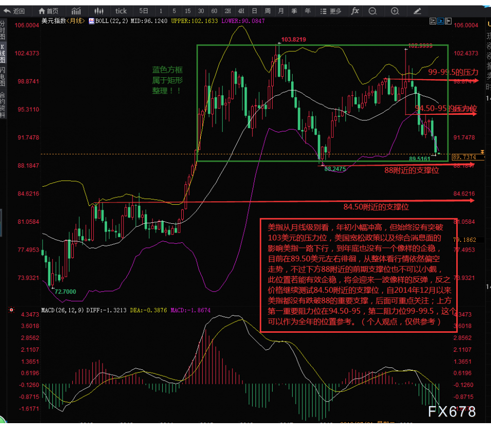 美指从月线级别看,年初小幅冲高,但始终没有突破103的压力位,美国宽松政策以及综合消息面的影响美指一路下行,到年底也没有一个像样的企稳,目前在89.50左右徘徊,从整体看行情依然偏空走势,不过下方88附近的前期支撑位也不可以小觑,此位置若能有效企稳,将会迎来一波像样的反弹,反之价格继续测试84.50附近的支撑位,自2014年12月以来美指都没有跌破88的重要支撑,后面可重点关注;上方第一重要阻力位在94.50-95,第二阻力位99-99.5,这个可以作为全年的位置参考。(个人观点,仅供参考)