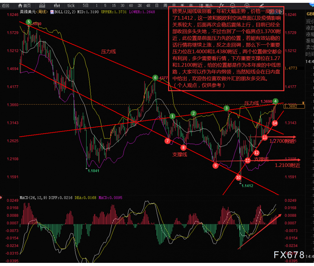 镑美从周线级别看,在2020年初大幅下挫,价格一度跌到了1.1412,这一波和脱欧利空消息面以及疫情影响关系较大,后面再次企稳后震荡上行,目前的2021年初,已经全部收回多头失地,不过也到了一个临界点1.3700附近,此位置是前面压力所在位置,若能有效站稳的话行情将继续上涨,反之走回调,那么下一个重要压力位在1.4000和1.4380附近,两个位置做空都会有利润,具体利润多少需要看行情,下方重要支撑位在1.2700和1.2100附近,给的位置都是作为本年度的中线思路,大家可以作为年内纲领,当然短线会在日内盘中给出,欢迎各位喜欢做外汇的朋友多交流。备注:图中红色标注位支撑点,绿色标注为压力点。(个人观点,仅供参考)