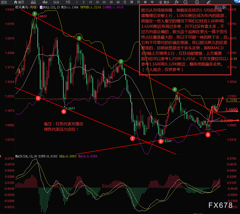欧元从月线级别看,在经历1-5月份的横盘整理后突破上行,1.0650附近成为年内的底部,前面在一些人看空的情况下我们已经在1.6080和1.6100附近布局过多单,虽然没有拿太多,不过方向是正确的,欧元这个品种在美元一揽子货币中所占比重是最大的,所以不可能一味的跌下去,且它有不可替代的价值在里面,所以欧元跌久了还是要涨的,目前依然是处于多头走势,指标MACD在0轴上方继续上行,红柱动能增强,上方重要阻力位可以参考1.2500-1.2550,下方支撑位可以参考1.1600和1.1200附近,整体思路偏多走势。(个人观点,仅供参考)