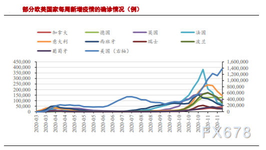 2020年的第四季度以来,以欧美为代表的发达国家疫情再次爆发。英国、法国、意大利、西班牙等欧洲主要国家最近一周的新增确诊病例仍然维持在 10 万上下,德国周确诊病例仍超过10万且当前疫情无明显调头趋势。美国当前疫情仍然持续高增,最近一周新增确诊病例仍然高达137万例且暂无缓和趋势,加州、德州、纽约州、佛罗里达州等经济重镇确诊数均在5万以上。照此情况,2021年前半年,欧美疫情是难以完全控制并结束,经济更难以得到恢复。