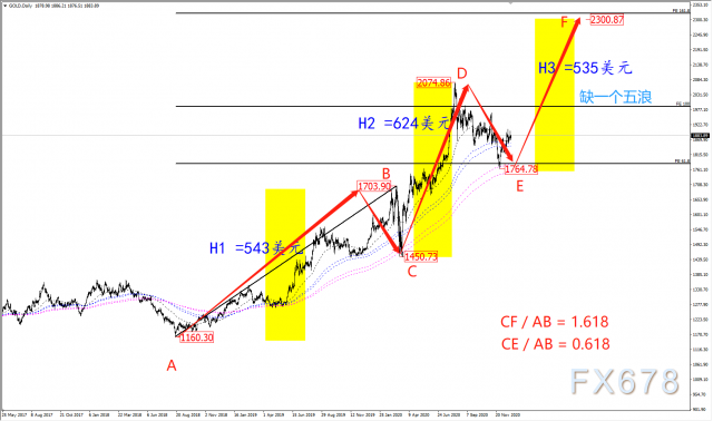 说完基本面的重点,再来看看技术面的价格走势。在现货黄金日线图上,从2018年的低点1160开始起涨,在2020年从1450开始加速,目前的上行趋势保持良好,本轮从2075-1765的下跌波段虽然高度达310整数点,但是其跌幅仅为38.2%,属于非常震荡的回调,后期继续看涨概率较大。
