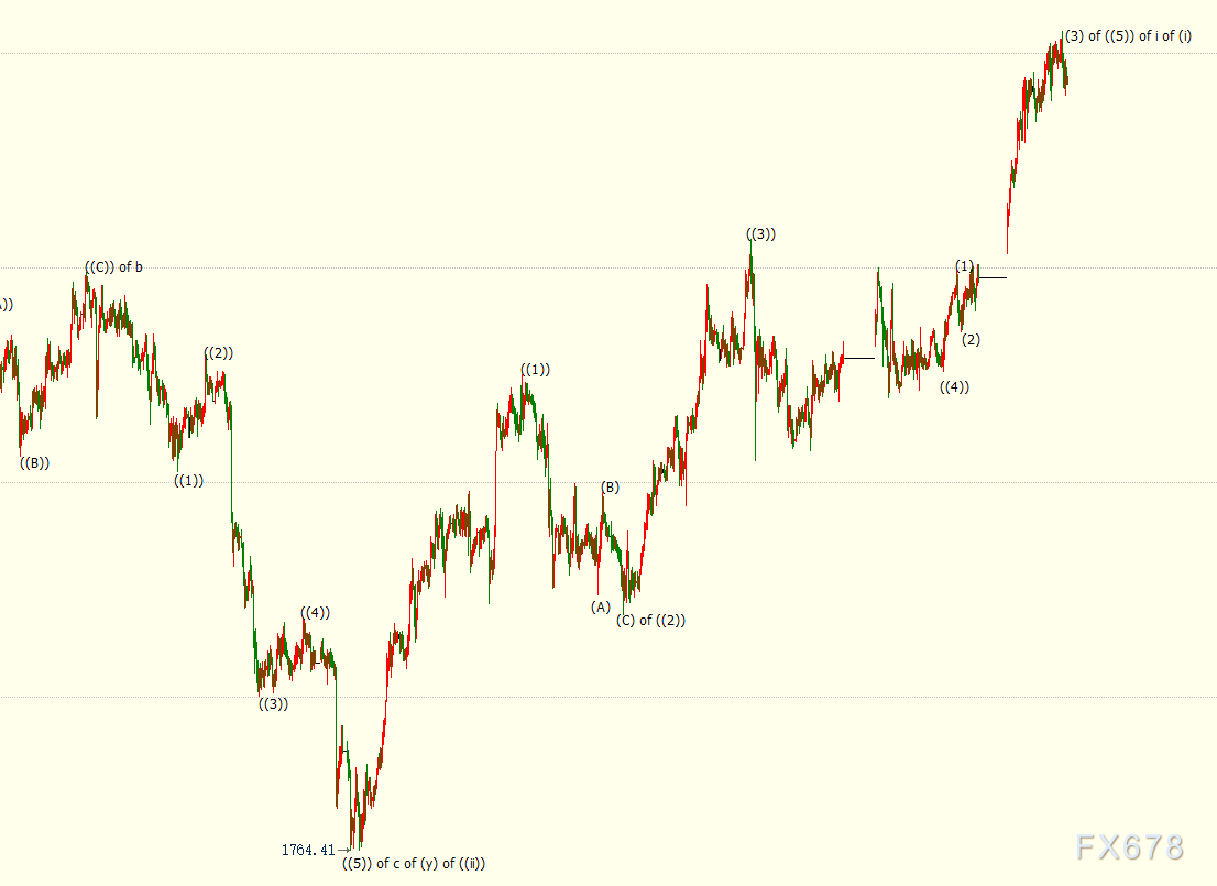 小时图上看,金价处于自1885美元开启的上行((5))浪走势,((5))浪是自1764美元开启的上行i浪的子浪。i浪则隶属于同样子1764美元开启的上行(i)浪的子浪。