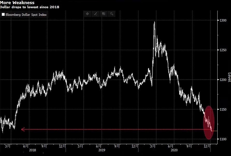 如下图所示,彭博美元指数创下2018年来最低位,且有进一步走软的趋势
