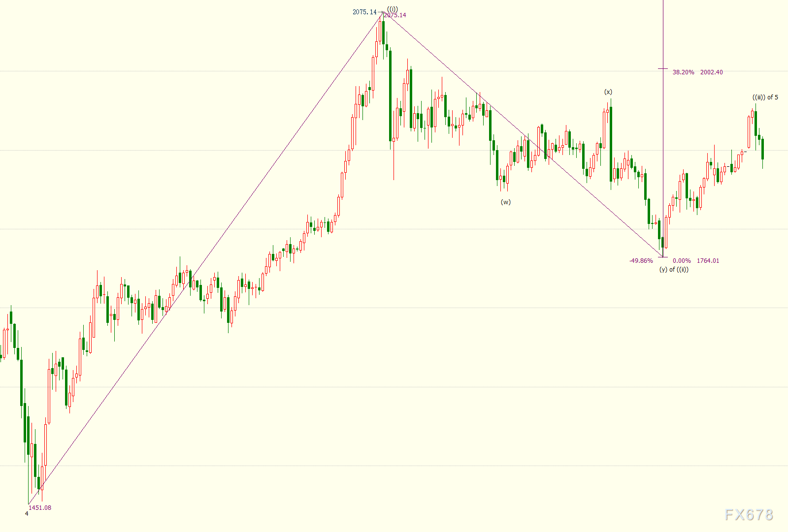 日线图上看,金价自1764美元开启上行((iii))浪走势,(i)浪是((iii))浪的三级子浪。((iii))浪的38.2%目标位在2002美元,((iii))浪是自1451美元开启的上行5浪的子浪。