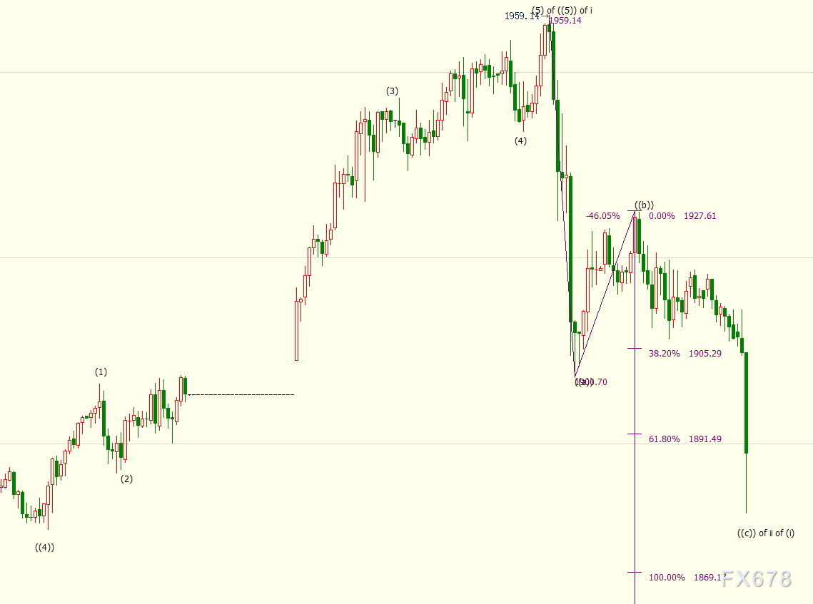小时图上看,金价处于自1927美元开启的((c))浪,下方支撑看向123.6%目标位1855美元。((c))浪是自1959美元开启的下行ii浪的子浪。ii浪是自1764美元开启的上行(i)浪的子浪。