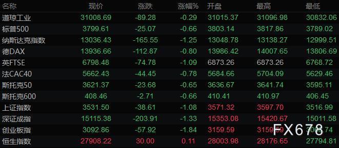 美股三大指数全部收跌,道琼斯指数收盘下跌89.30点,跌幅0.29%,报31008.69点;标普500指数收盘下跌25.10点,跌幅0.66%,报3799.61点;纳斯达克指数收盘下跌165.50点,跌幅1.25%,报13036.43点。