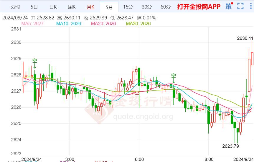 周二(9月24日)本交易日国际金价日内维持震荡走势,今日开盘报2628.42美元/盎司,最高触及2630.11美元/盎司,最低触及2623.79美元/盎司,截止发稿金价报2629.61美元/盎司,涨幅0.05%。金融市场对美联储决策者的发言反应平淡。市场认为美联储在11月6-7日会议上降息25个基点或50个基点的可能性几乎一样。