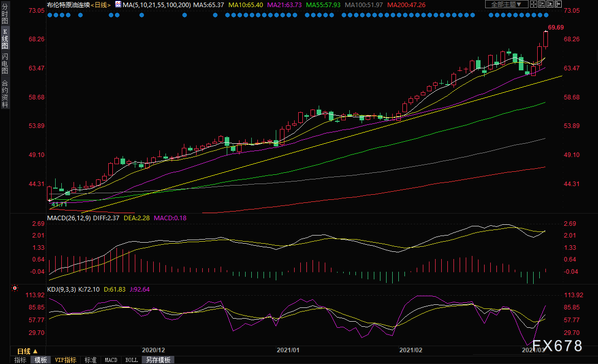 上周布伦特油价也大涨7.83%,最高触及69.69,为2020年1月9日以来新高,收报69.69美元/桶;但种种利好支撑下,多个知名投行均进一步上调油价预期。预计周一布油开盘也将跳涨继续冲高。