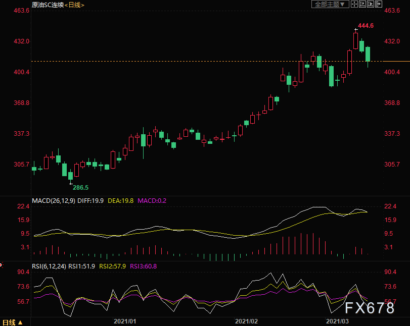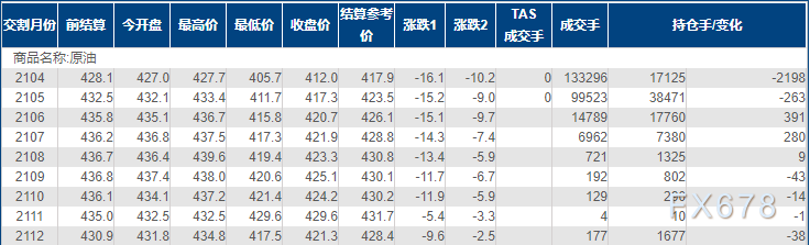 上海原油价格大跌,主力合约2104终盘收于412元/桶,跌16.1元/桶,跌幅3.76%。