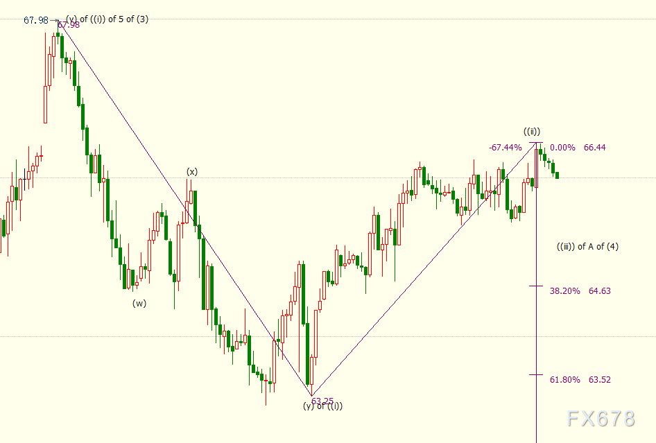 A浪料细分为((i))((ii))((iii))((iv))((v))五子浪。小时图上看,若油价自66.44美元开启下行((iii))浪走势,下方支撑看向23.6%目标位65.32美元和38.2%目标位64.63美元。