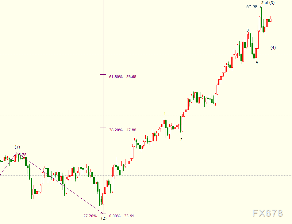 日线图上看,NYMEX原油或已在67.98美元结束自33.64美元开启的上行(3)浪走势,并开启回调(4)浪走势。(4)浪料由A、B、C三个一级子浪组成。