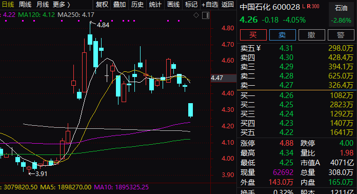 “两桶油”中,中国石化(600028,股吧)A股大幅下跌4.04%,中国石化H股则大幅下跌5.56%;中国石油(601857,股吧)A股则下跌2.04%。中国石油H股大跌5.63%。?