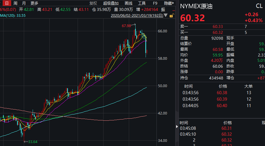 在今天国内原油期货价格大跌之前,当地时间3月18日美油和布油期货刚已经历一番暴跌。当天美国NYMEX原油期货主力合约大跌7.72%,跌破60美元/桶。布油期货主力合约也大跌7.81%。在此之前一段时间,上述两大原油期货主力合约均已至近几个月的高位。?