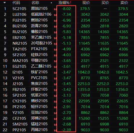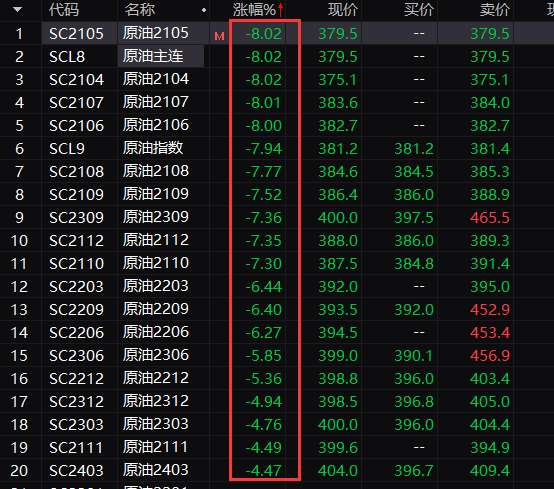 在国内原油期货主力合约跌停的同时,其他多个月份交割的原油期货合约也纷纷大跌,甚至触及跌停。?